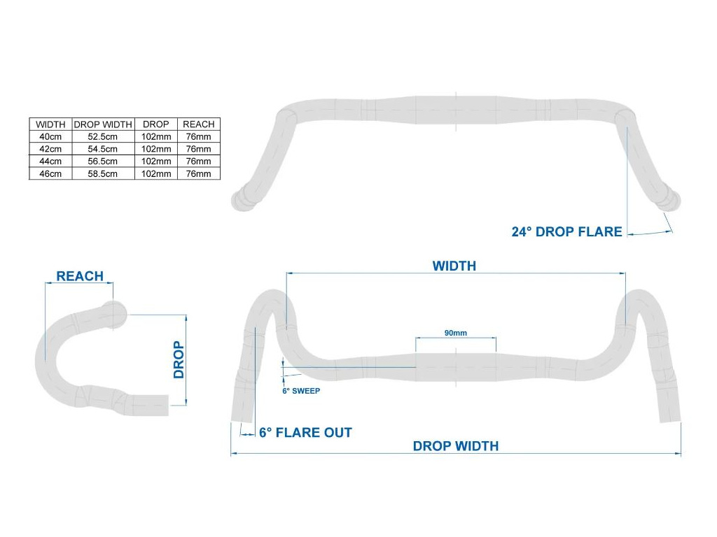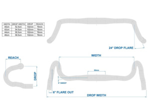 Řídítka jsou široká ve spodní části 585 mm / 565 mm a v místě uchycení pák 460 mm / 440 mm. Drop řídítek je 102 mm, flare 76 mm, drop flare pod úhlem 24° a flare out pak 6° a backsweep 6°.