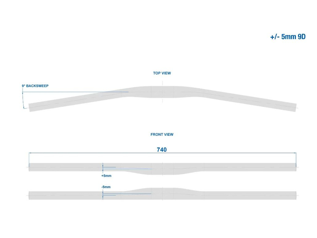 MTB hliníková řídítka, hmotnost 232 g, délka 740 mm, pro představec 31,8 mm, nastavitelná výška +/- 5 mm, backsweep 9°.
