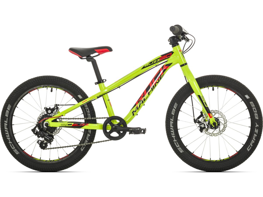 Dětské 20" kolo Rock Machine Blizz 20 s nízkou hmotností 9,8 kg, skvělou ovladatelností a vysokou přilnavostí širokých plášťů Schwalbe Crazy Bob. O bezpečné zastavení se starají kotoučové brzdy Tektro.