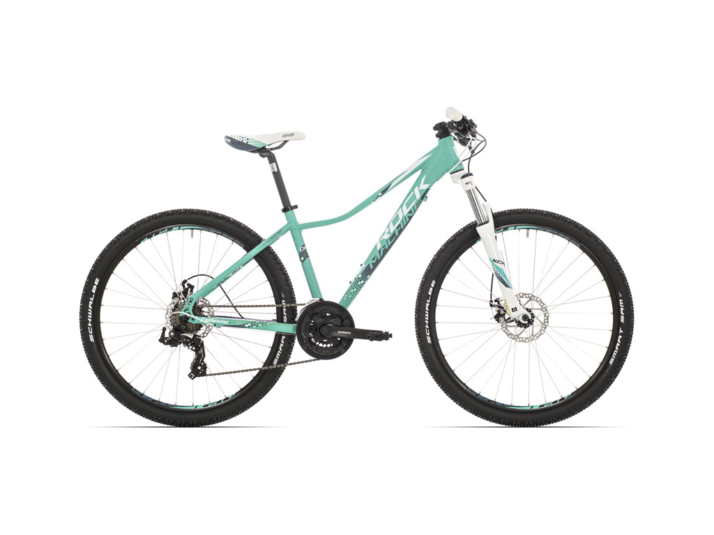 Dámské horské kolo Rock Machine Catherine 60 s hliníkovým rámem ve stylových barvách a 27,5 palcovými koly. Ideální kolo pro rekreační cyklistky. Osazeno je odpruženou vidlicí Suntour XCT, mechanickými kotoučovými brzdami a komponenty Shimano s 21 převody.