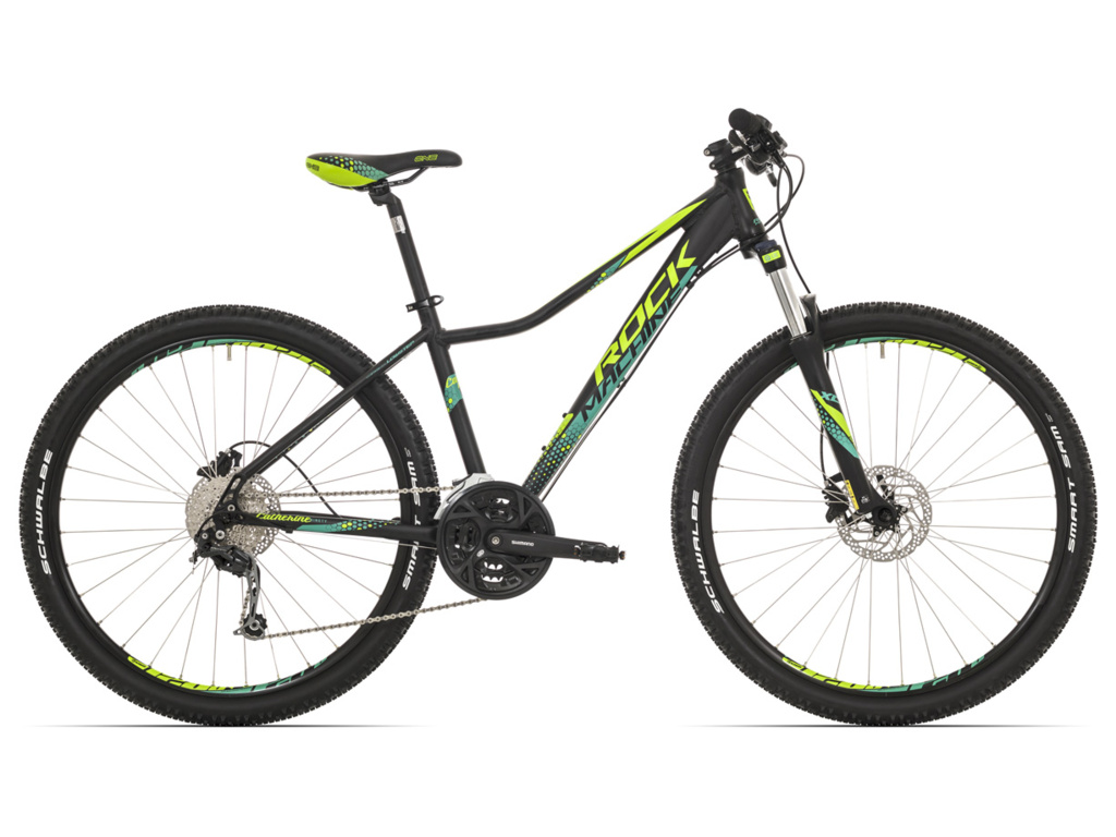 Dámské horské kolo Rock Machine Catherine 90 s hliníkovým rámem ve stylových barvách a 27,5 palcovými koly. Ideální kolo pro rekreační cyklistky. Osazeno je uzamykatelnou odpruženou vidlicí Suntour XCM, hydraulickými kotoučovými brzdami Shimano a komponenty Shimano s 27 převody.