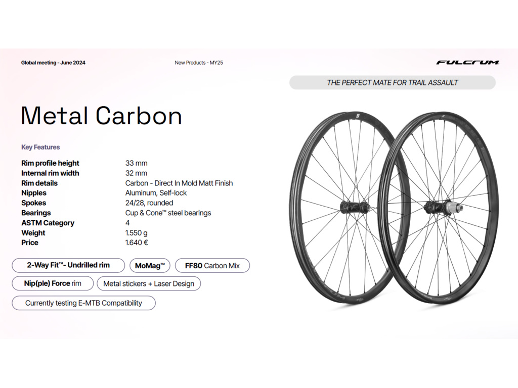 Návrat Fulcrumu do světa MTB byl zpočátku zaměřen na XC závodění s představením rodiny Red Zone a jejích různých úrovní výkonu. To vedlo k postupnému a přirozenému přechodu na trailové ježdění. Metal Carbon a Metal ALX byly speciálně navrženy pro tento segment, hladce spojují požadavky na vysoký výkon na trailu s potřebou hbitosti a odolnosti.