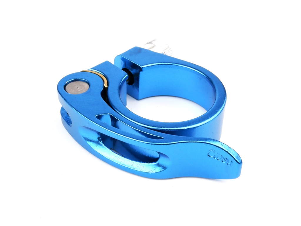 Lehká sedlová objímka s rychloupínacím mechanismem je vhodná pro hliníkové sedlovky. V modrém eloxu.