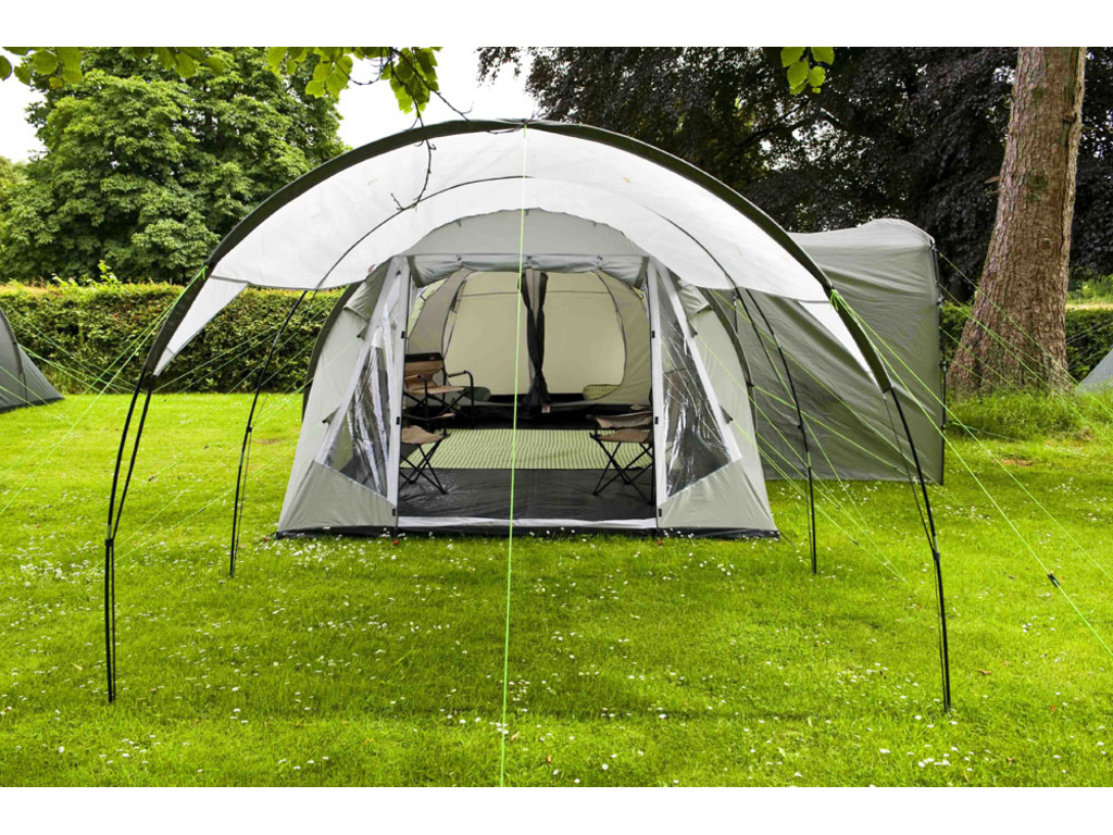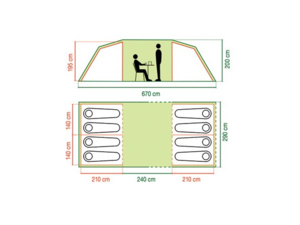 Opravdu nadstandardně dimenzovaný tunelový stan poskytne pohodlí domova. Snadnost stavby a prostornost překvapí každého, kdo nezná tyto hlavní výhody tunelových stanů. Velkou variabilitu vnitřního prostoru přinášejí 4 dvoumístné vpínací ložnice.