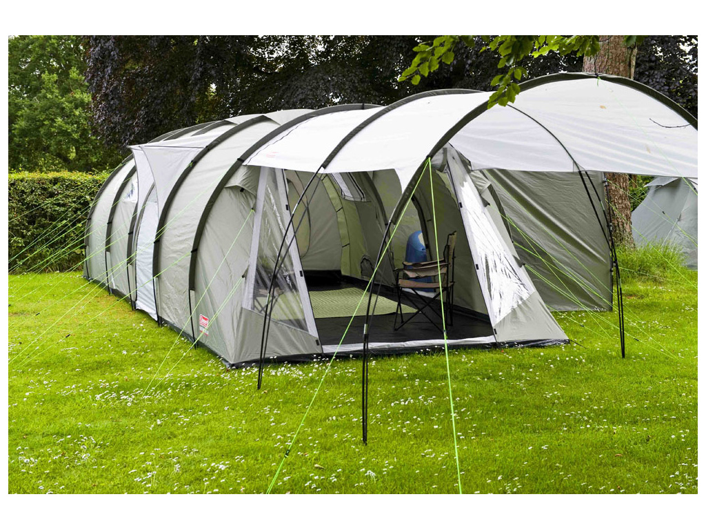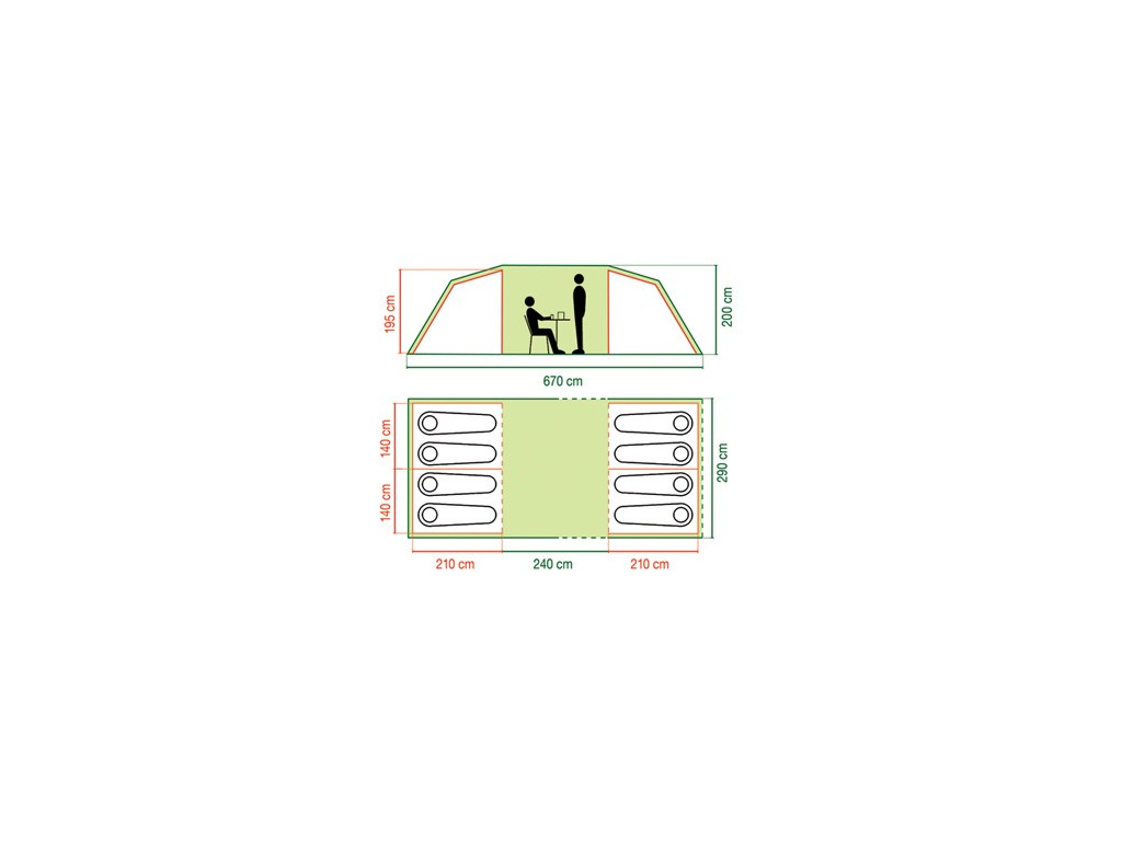Opravdu nadstandardně dimenzovaný tunelový stan poskytne pohodlí domova. Snadnost stavby a prostornost překvapí každého, kdo nezná tyto hlavní výhody tunelových stanů. Velkou variabilitu vnitřního prostoru přinášejí 4 dvoumístné vpínací ložnice. Ložnice na každé straně lze propojit a vznikne tak 1-2 větší čtyřmístné ložnice. Případně lze použít stan i bez ložnic - například jako párty stan.V celé ploše všitá podlážka dává šanci udržet uvnitř stanu dokonalou čistotu za každého počasí. V hale se mohou sejít všichni obyvatelé u dlouhého stolu, ať už k jídlu, večerní zábavě nebo přečkání špatného počasí. Strach z ohnutého hřbetu nemusí mít ani dlouháni - výška haly je 200 cm.