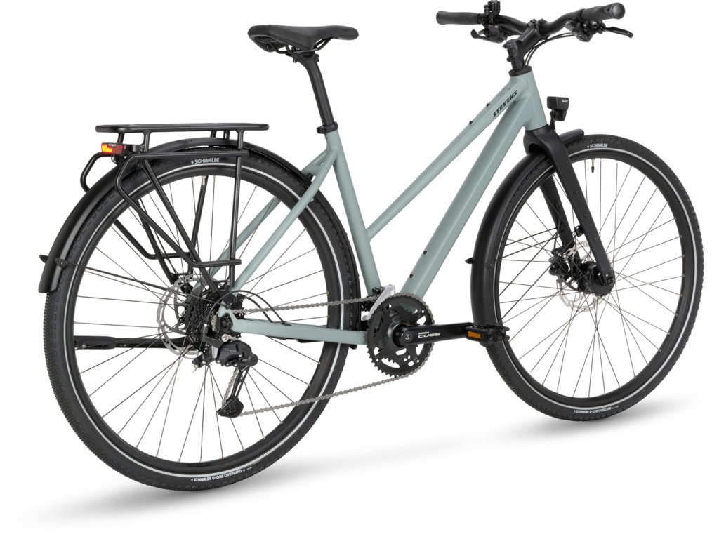 STEVENS Caleta 6.1 je ideální volbou pro každodenní dojíždění, rekreační vyjížďky i víkendové výlety. Jeho lehký hliníkový rám v kombinaci s pevnou vidlicí S-Lite Aluminium zajišťuje spolehlivé vedení stopy, zatímco komponenty Shimano CUES U4000 nabízejí hladké a přesné řazení v rozsahu 2x9 rychlostí. Hydraulické kotoučové brzdy Tektro zaručují účinné zastavení za každého počasí. Osvětlení napájené nábojovým dynamem a široké 45mm pláště Schwalbe G-One Overland poskytují bezpečnost, pohodlí i jistotu při jízdě ve městě i mimo něj.