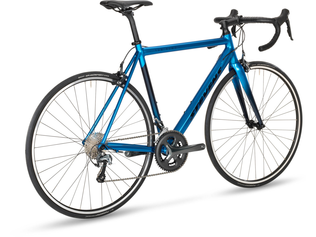 Silniční kolo STEVENS San Remo Fjord Blue s pevným hliníkovým rámem, karbonovou vidlicí a 2x10rychlostní sadou Shimano Tiagra. Ideální pro hladkou a spolehlivou jízdu s elegantním designem.