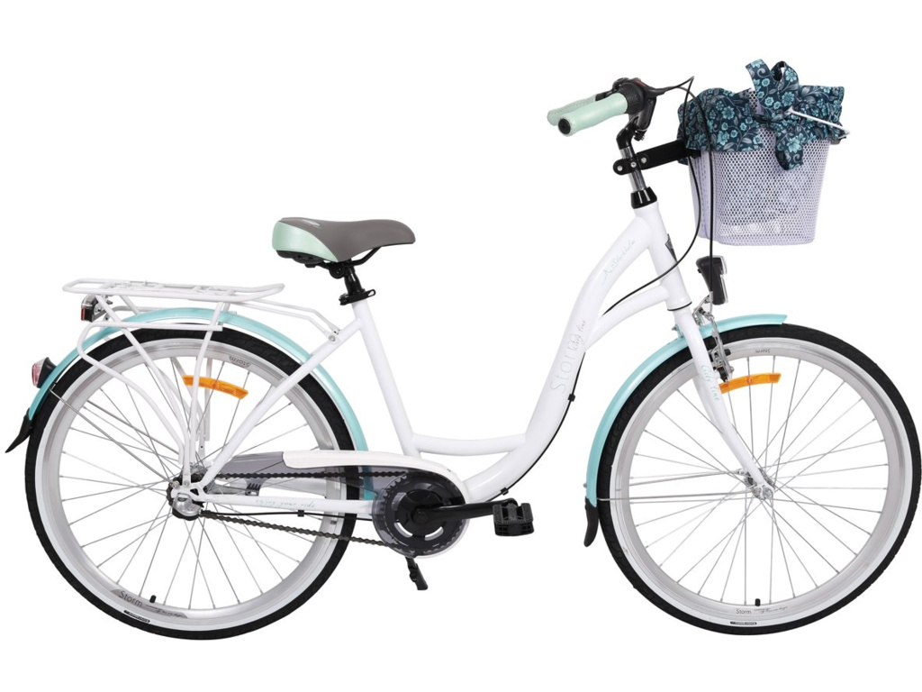 STORM Stockholm 3 je elegantní a pohodlné mětské kolo s 3 rychlostním řazením v zadním náboji. Tuhý ocelový rám je díky snížené konstrukci uzpůsobený pro pohodlné nastoupení a vhodný pro výšku postavy cca od 155 do 175 cm. Kolo má 3 rychlostní řazení v zadním náboji Shimano Nexus a zadní protišlapnou brzdu doplněnou o přední ráfkovou V-brzdu. Storm Stockholm je osazen bateriovým LED osvětlením, blatníky, nosičem, stojanem a předním košem na řídítkách.