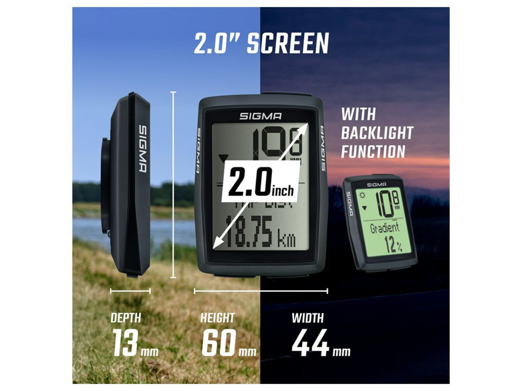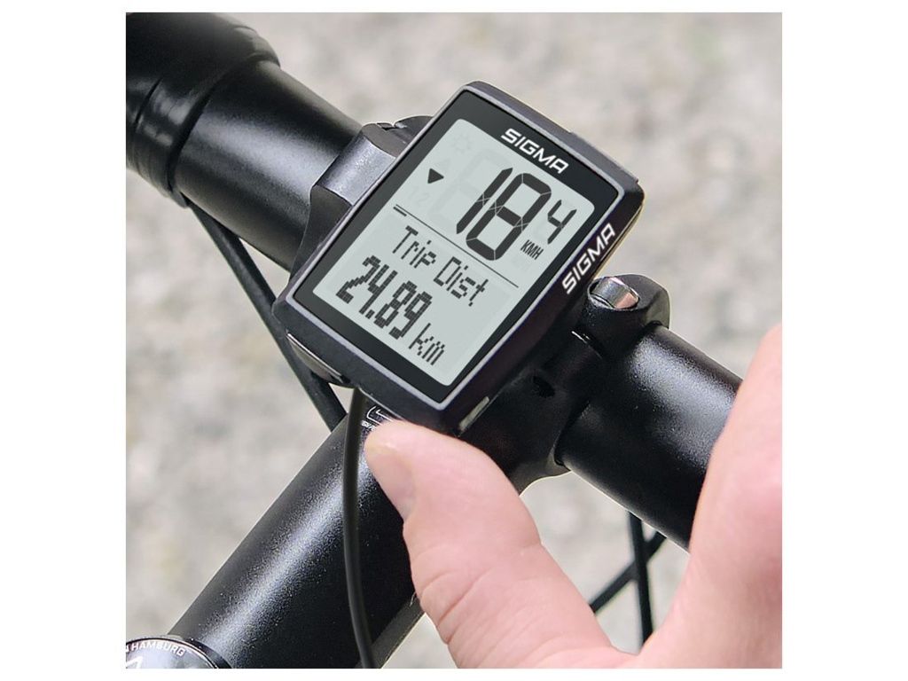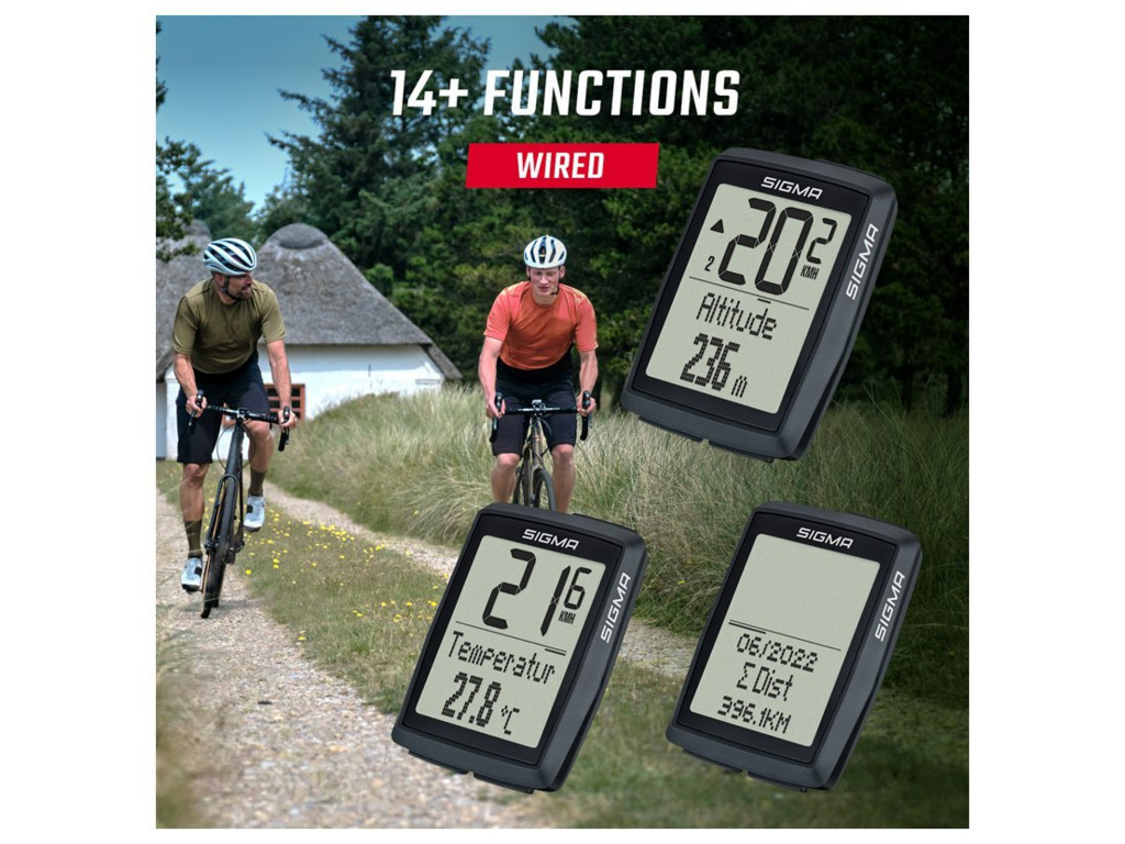 S funkcí měření nadmořské výšky je cyklopočítač BC 14.0 WR nejvyšším modelem řady SIGMA ORIGINALS. S mnoha funkcemi a vychytávkami je tento kabelový cyklopočítač skutečně všestranným pomocníkem. Mimo to ukládá statistiky za posledních dvanáct měsíců - volitelně také pro druhé kolo. Tento cyklopočítač disponuje barometrickým měřením výšky a lze ho používat na dvou různých kolech. Navíc zobrazuje denní kilometry, rychlost, celkový počet kilometrů, dobu jízdy, hodiny, celkovou dobu jízdy, průměrnou rychlost, porovnání aktuální rychlosti s průměrnou rychlosti, maximální rychlost, aktuální teplotu a měsíční statistiky.