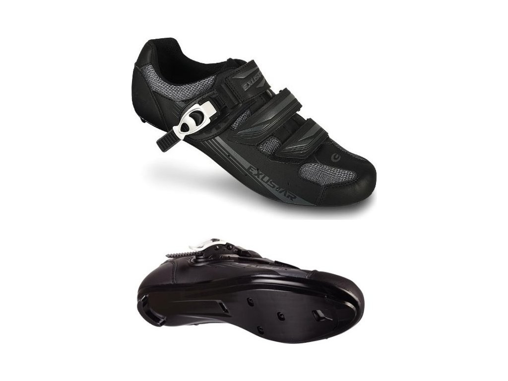 Silniční tretry Exustar SR4123 se dvěmi suchými zipy a přezkou Microlock M2. Vhodné pro začínající a hobby jezdce.