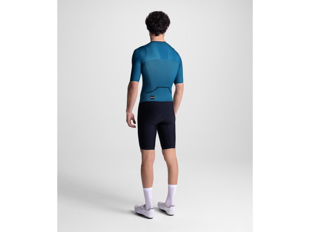 SANTINI Riel 05 představuje absolutní špičku v inženýrství triatlonového oblečení. Tato kombinéza pro dlouhé tratě byla testována ve větrném tunelu a optimalizována pro profesionální výkon, čemuž odpovídají i prodloužené rukávy a nohavice pro co nejhladší obtékání vzduchu.