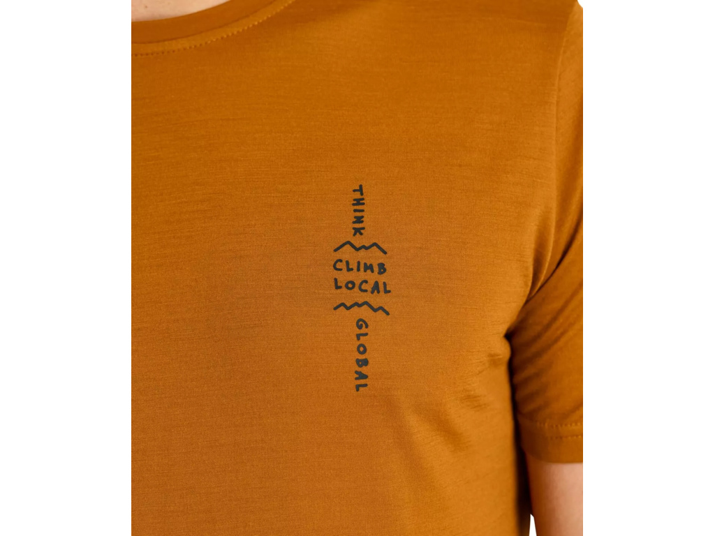 Stylový nápis “THINK GLOBAL, CLIMB LOCAL” na hrudi.