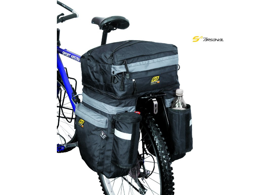 Velká a praktická trojbrašna na zadní nosič s odnímatelnou horní spacákovou brašnou je ideální pro vaše výlety! Brašna se k nosiči přichycuje pomocí gumicuku s háčkem.