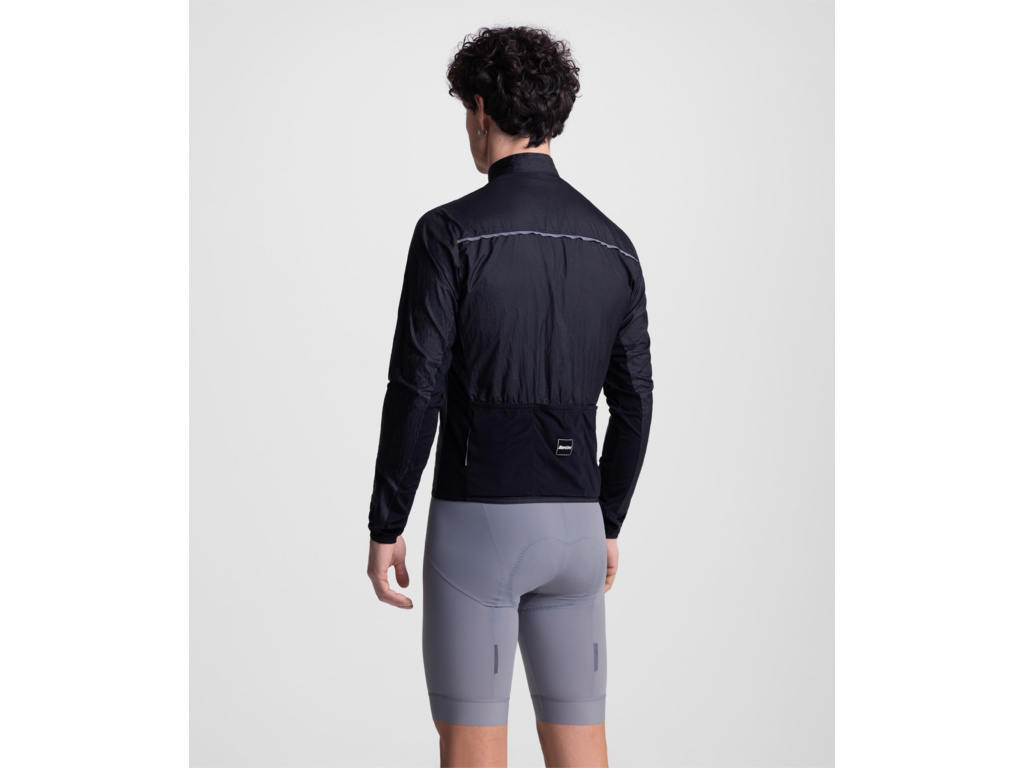 Lehká větruodolná bunda SANTINI RTR Wind s přiléhavým střihem, reflexními prvky a zadními kapsami je ideální volbou pro proměnlivé jarní a podzimní podmínky – snadno sbalitelná a připravená kdykoli zasáhnout.
