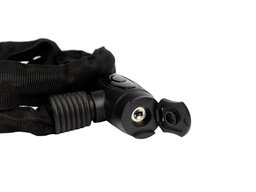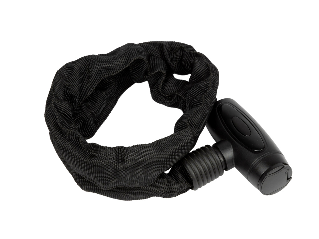 Spolehlivý a odolný řetězový zámek na klíč. Měkká tkanina na povrchu chrání lak kola před poškozením. Řetěz o celkové délce 900 mm se dá jednoduše smotat do menšího rozměru.